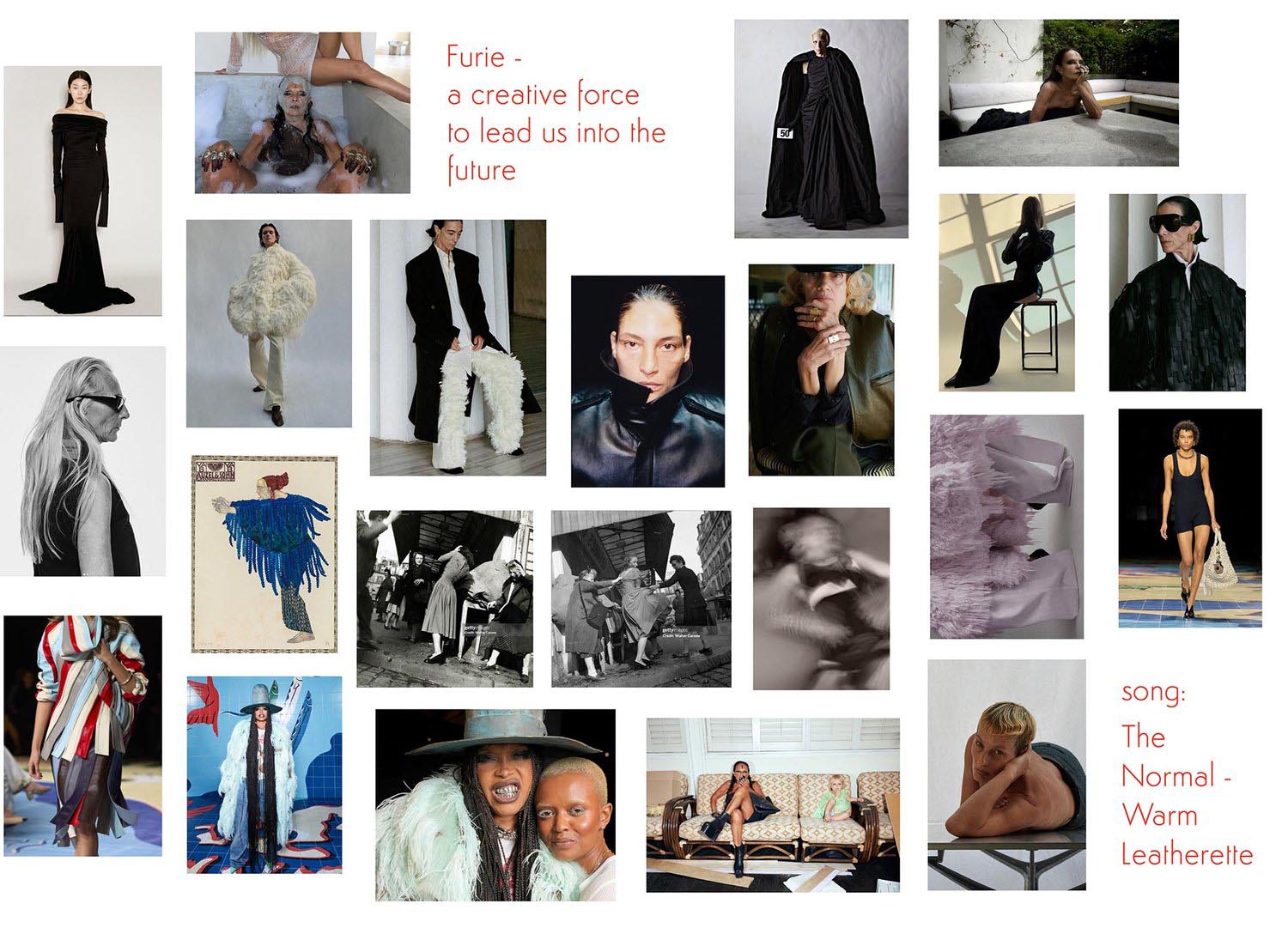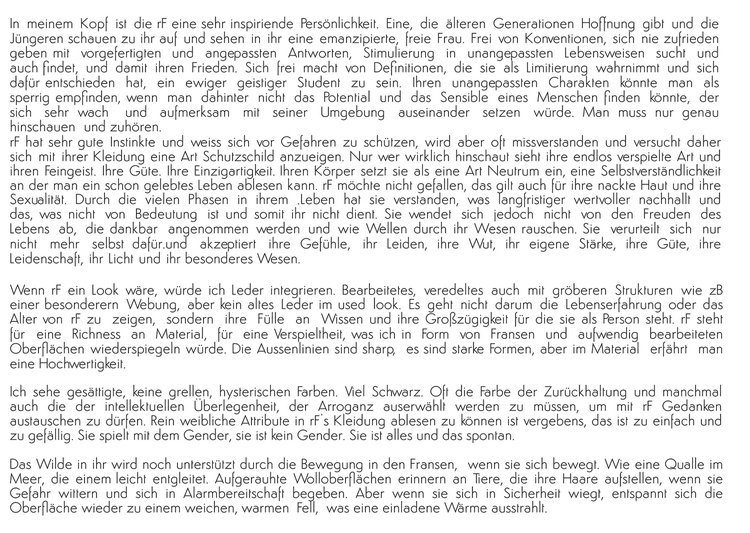 If rF were a look, I would incorporate leather. A leather that has been worked and refined, but not an old leather with a worn look. It's not about showing life experience or the age of rF, but rather the wealth of knowledge and generosity that she stands for as a person. rF represents a richness of material, a playfulness that I would reflect in the form of fringes and elaborately worked surfaces. The outer lines are sharp, they are strong forms, but in the material you experience a high quality.